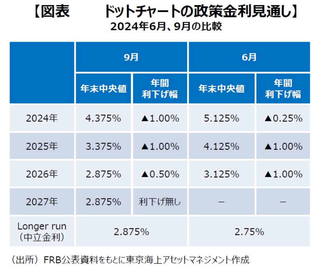 今回のFOMCで最⼤の焦点であったドットチャート(FOMC参加者の政策⾦利⾒通し)では、2024年末の政策⾦利(中央値)が4.375%と、6⽉時点(5.125%)から▲0.75%下⽅修正され、年内残り2回(11⽉、12⽉)の会合で計▲0.50%の利下げが⽰唆されました(図表7)。