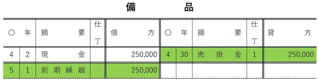 次に、次期繰越の反対側に次の会計期間の最初の日付を記入するとともに、摘要欄に「前期繰越」して次期繰越と同額を記入します。