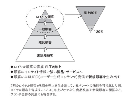 さらに、ロイヤル顧客は、企業・ブランドのファンですから、ときに企業の代弁者となって、SNSで発信したり口コミしたりすることによって、新しい顧客を連れてきてくれる効果も発揮します。