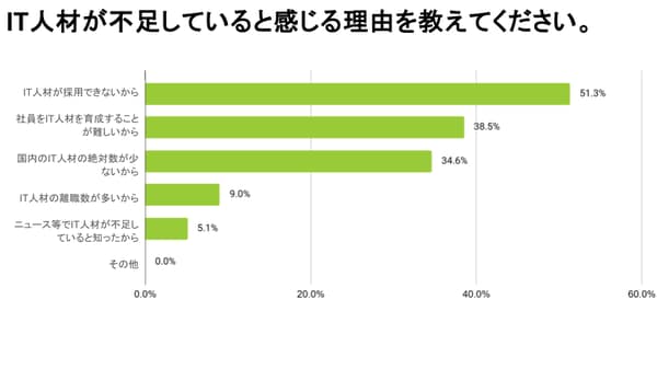 中小企業の経営者に対してIT人材が不足していると感じる理由を尋ねたところ、最も多かったのは「IT人材を採用できないから」が51.3%で、その比率は前回調査(46.7%)に比べて上昇した(複数回答)。このほか、「IT人材の離職数が多いから」は9%で前回から微減。「ニュース等でIT人材が不足していると知ったから」も5%で微減だった。