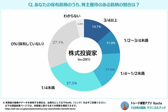 「0%(保有していない)」と回答した人は27.1%にとどまる一方で、保有していると回答した人(「1/4未満」~「3/4以上」の合計)は69.1%に上りました。多くの個人投資家が、何かしらの株主優待を受け取っていることが分かります。