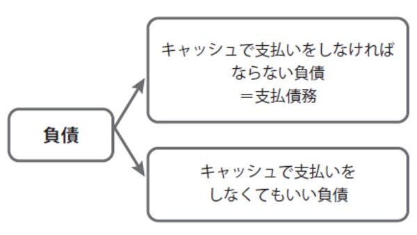 1つはキャッシュで支払いをしなければならない負債でもう1つはキャッシュで支払いをしなくてよい負債です。このうち、前者のキャッシュで支払いをしなければならない負債が支払債務です。