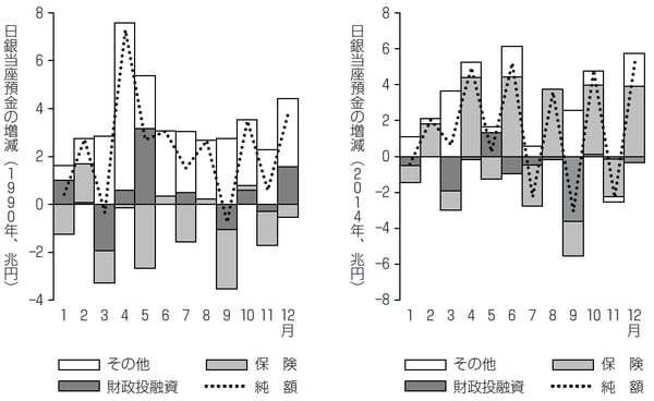 保険が奇数月にマイナス,偶数月にプラスであるのは,偶数月に年金が給付されるためです。3月と9月に財政投融資のマイナスが目立つのは,これらの月に地方公共団体から元利払いを受けるためです。1990年4月にその他部門のプラスが目立つのは,この月に郵便貯金が大量償還されたためです(1)。純額をみると,偶数月に年金が給付されるために大きく増減する傾向にあることがわかります。