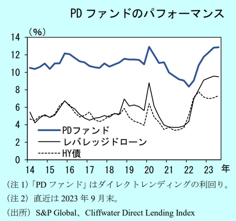 三菱UFJ信託銀行のリポートによると、PDファンドは、銀行からの借入やハイ・イールド債と比べ、①銀行以外の主体による資金供給 ②借り手の信用力が相対的に乏しい ③流通市場がなく流動性が乏しい などが特徴だ。