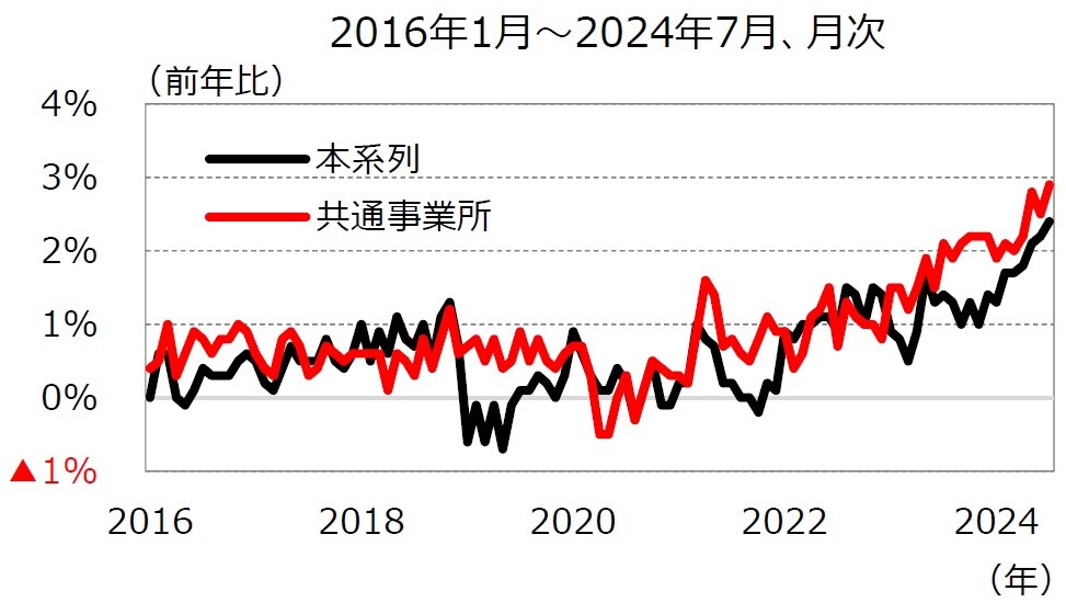 賃金の実質化には、消費者物価指数「持家の帰属家賃を除く総合」(以下、物価)が用いられ、8月は前年比+3.5%(7月:同+3.2%)となっています。2023年8月から開始した電気・ガス代補助金が7月(6月使用分)でいったん終了し、電気代、都市ガス代が高い伸びとなったことが物価を押し上げました。この点は、8月の実質賃金の下押しに作用することになるものの、11月以降の物価上昇率は補助金の終了により鈍化する可能性が高いと考えられます。