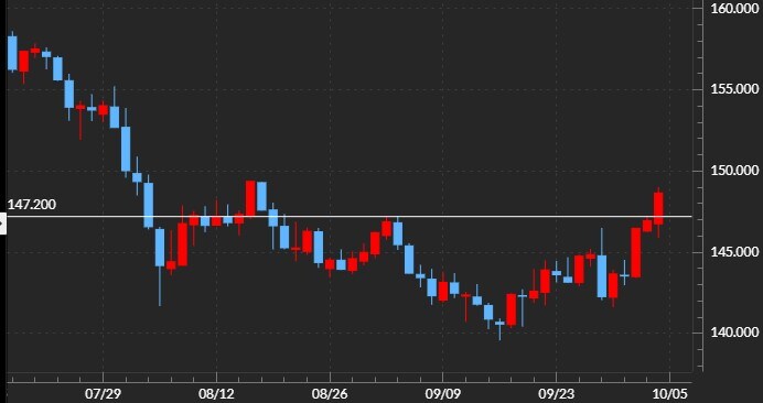 2日に石破総理が利上げを急がない旨の発言を行ったことが材料視され、さらに4日発表の米9月雇用統計が予想より強い結果だったことで、9月の米ドル高値147.2円を更新すると米ドル高・円安が加速するところとなりました。