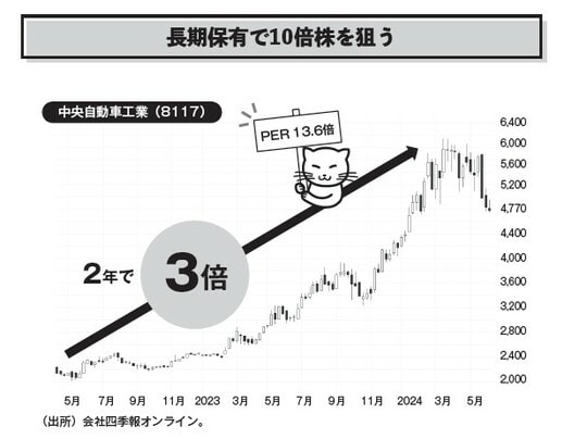 私が投資している銘柄で言うと、中央自動車工業(8117)などはまさにその典型例と言っても良いかも知れません[図表1]。2024年5月2日時点の株価は5,550円の値がさ株ではありますが、PERは13.6倍です。チャートを見ればわかりますが、2022年5月12日に2,005円まで調整した後、2024年3月22日には5,940円という高値を付けています。