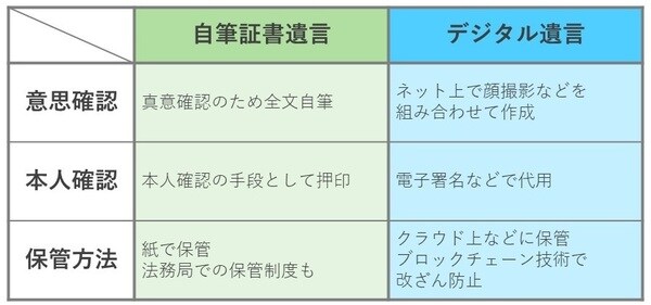自筆証書遺言も、相続人に見つけてもらえない、紛失する、改ざんされるなどの理由で相続争いになることもあります。そういった状況を考えると、自筆証書遺言と比較した場合、デジタル技術の活用によって一定の信頼性を確保できるデジタル遺言のほうがメリットがあるといえるでしょう。