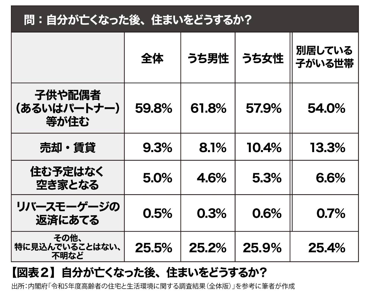 ![[図表2]自分が亡くなった後、住まいをどうするか? 出所:内閣府「令和5年度 高齢者の住宅と生活環境に関する調査結果(全体版)」をもとに筆者作成](https://ggo.ismcdn.jp/mwimgs/c/9/540/img_c9deee6294e9d8bfbe9169f64edd8e5a155528.jpg)