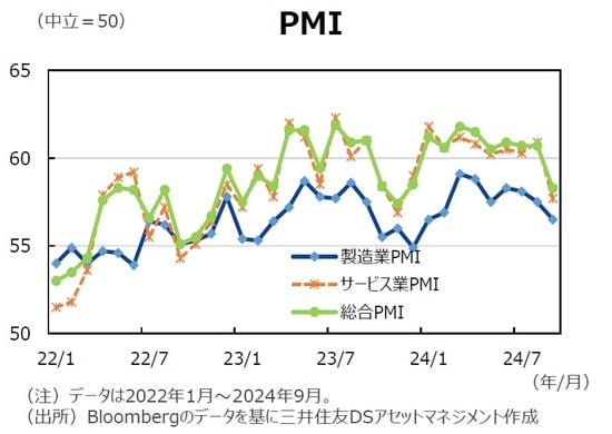 9月の総合PMIは58.3と8月から低下したものの、依然として中立の50を大きく上回って推移している。製造業PMIは56.5と8月の57.5から低下し、サービス業PMIは57.7と8月の60.9から低下したものの、景気は引き続き堅調であることを示唆している。