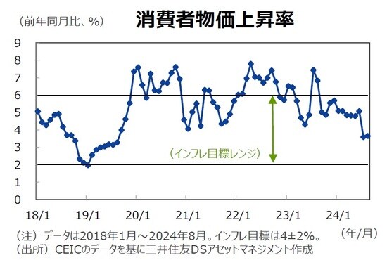 雨季(6~9月)の降水量が不足すると、夏季に農産物インフレが上振れしやすくなる。6月後半に一時的に降雨量は長期平均を下回ったが、7月から9月にかけてほぼ長期平均に沿った降雨量となった。8月の消費者物価上昇率は前年同月比+3.6%と低位で推移したものの、9月以降は食料品インフレはベース効果によって加速しやすく、消費者物価上昇率は9月以降、インフレターゲットレンジ内ながらも加速する方向に向かいやすい。