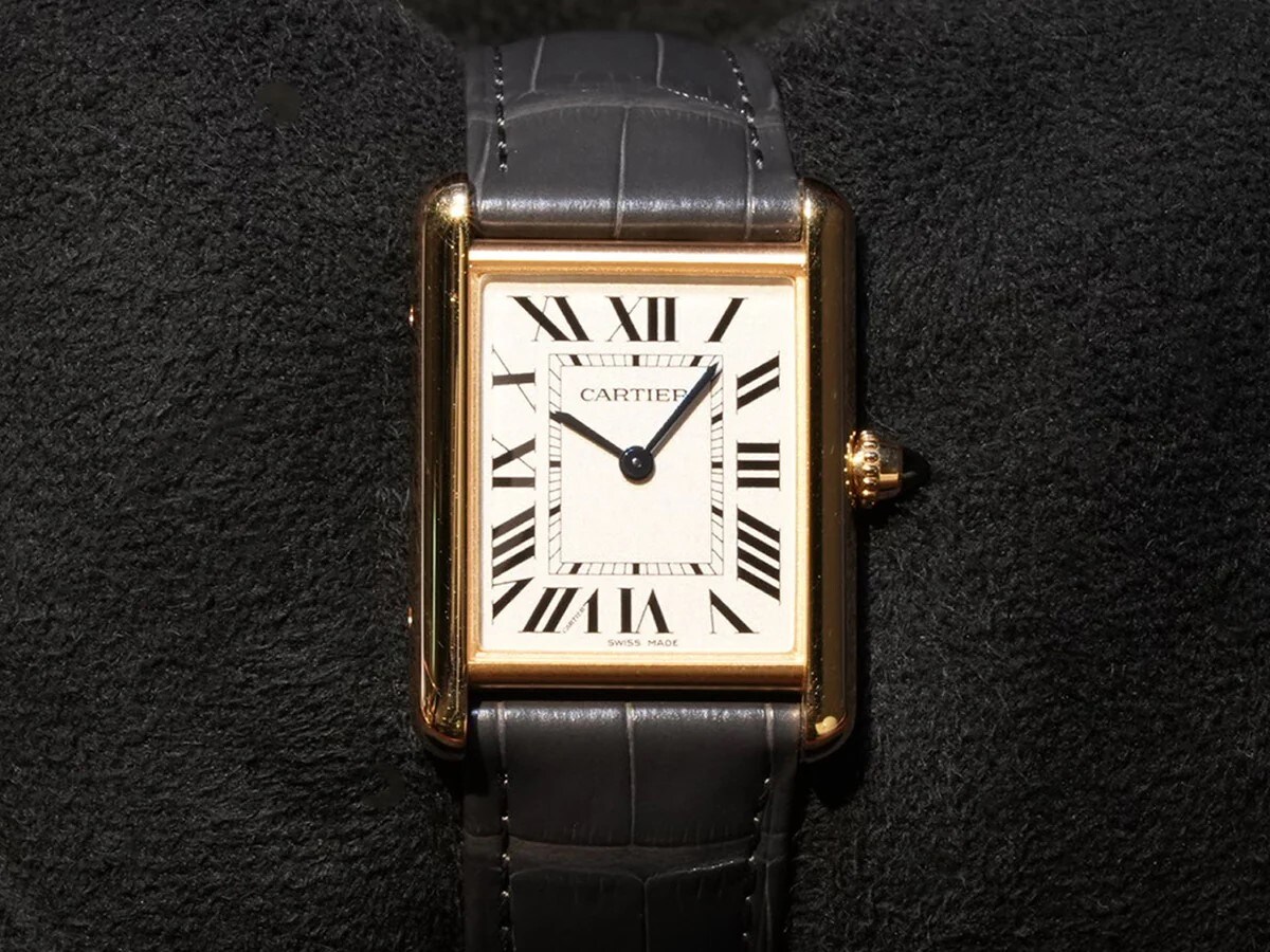 「カルティエのなかでもメインモデルの一つ。レクタンギュラーケースが特徴で、クラシックかつ上品なデザインが人気です。ジャケットやスーツによく似合います」。