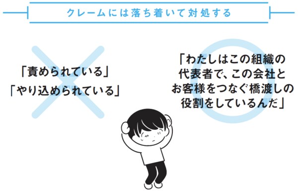 人は「自分が責められている」「やり込められている」と思うと、過剰に構えてしまうものです。思い当たる人は、「わたしはこの組織の代表者で、この会社とお客様をつなぐ橋渡しの役割をしているんだ」と自分に言い聞かせるようにしてください。対応に慣れるには、場数を踏むことも必要です。