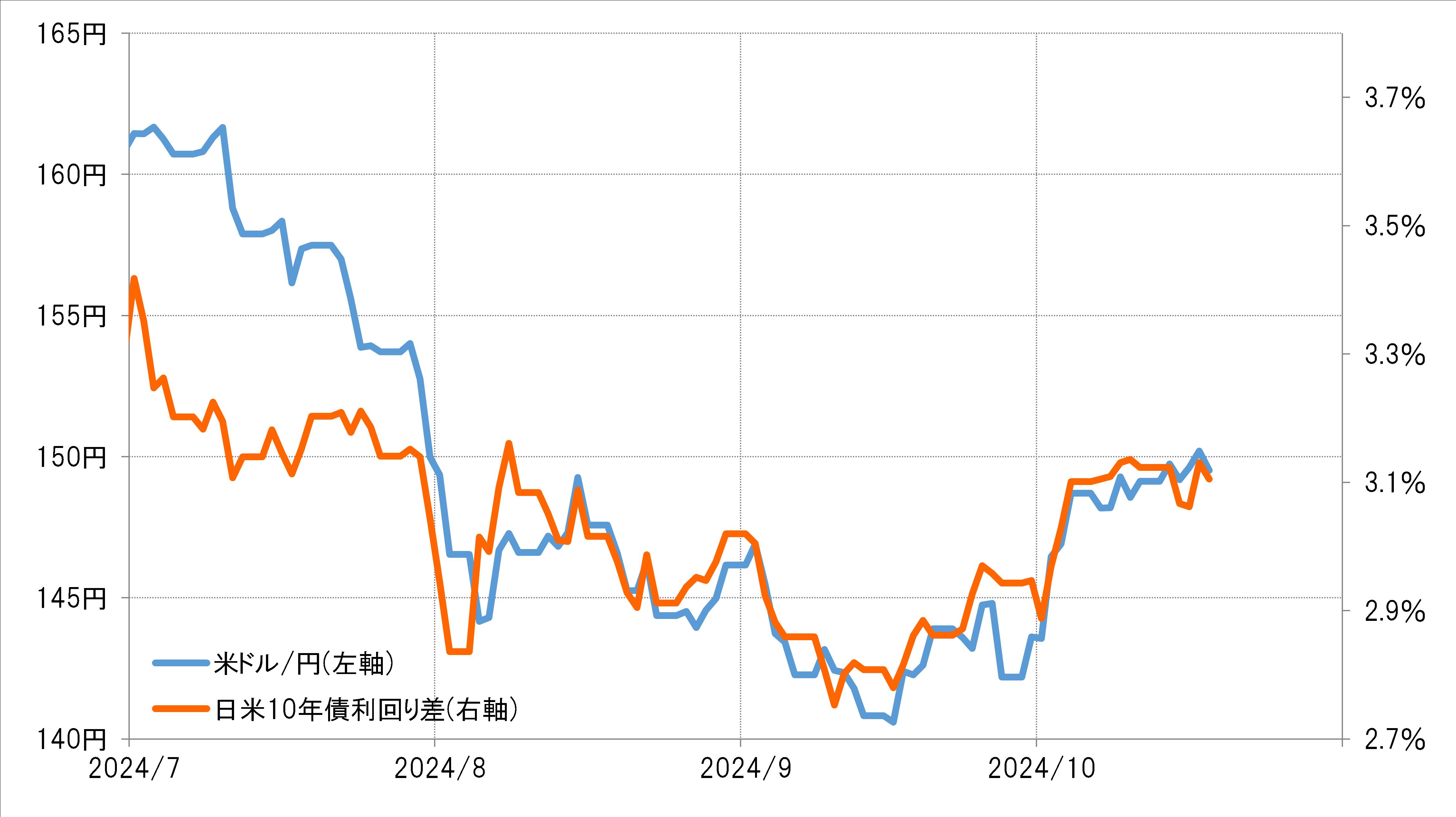 このような米ドル/円の動きは、基本的には日米10年債利回り差との相関が続いたものでした(図表2参照)。