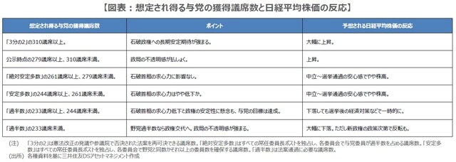 与党の議席数増で株高、減少でも絶対安定多数維持なら影響軽微、安定多数未達で株安も