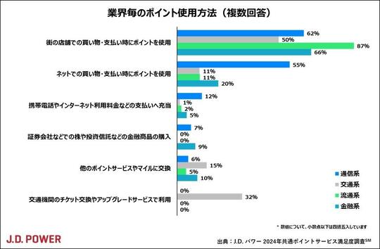 通信系では「携帯電話やインターネット利用料金などの支払いへ充当」している割合は12%と他より高く(流通系2%、金融系5%、交通系1%)、「ネットでの買い物・支払い時にポイントを使用」している割合も55%と他より高くなっている(流通系11%、金融系20%、交通系11%)。