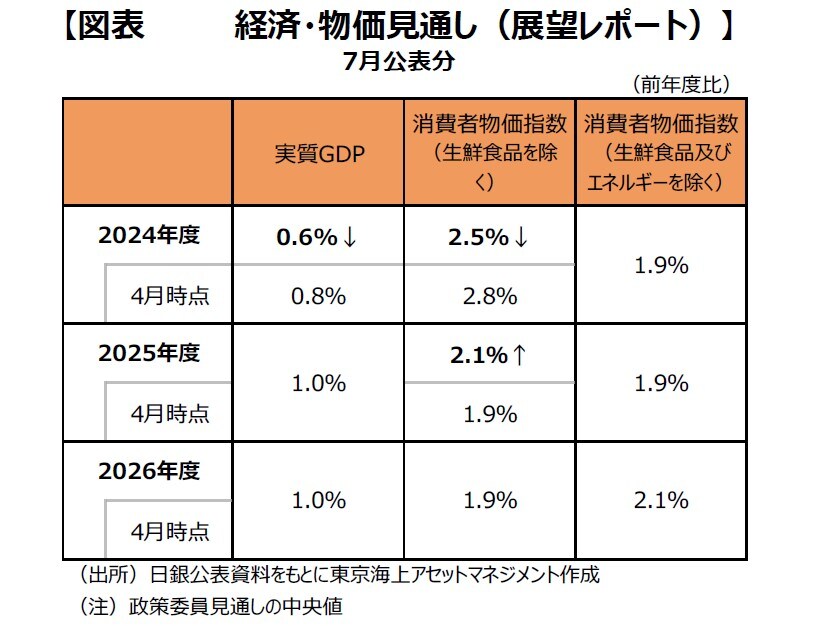 今会合では、経済・物価⾒通しを⽰す展望レポートが公表されます。7⽉の展望レポートに沿った経済・物価動向が継続しているとして、⽇銀は7⽉時点の経済・物価⾒通しをおおむね維持するとみています(図表3)。