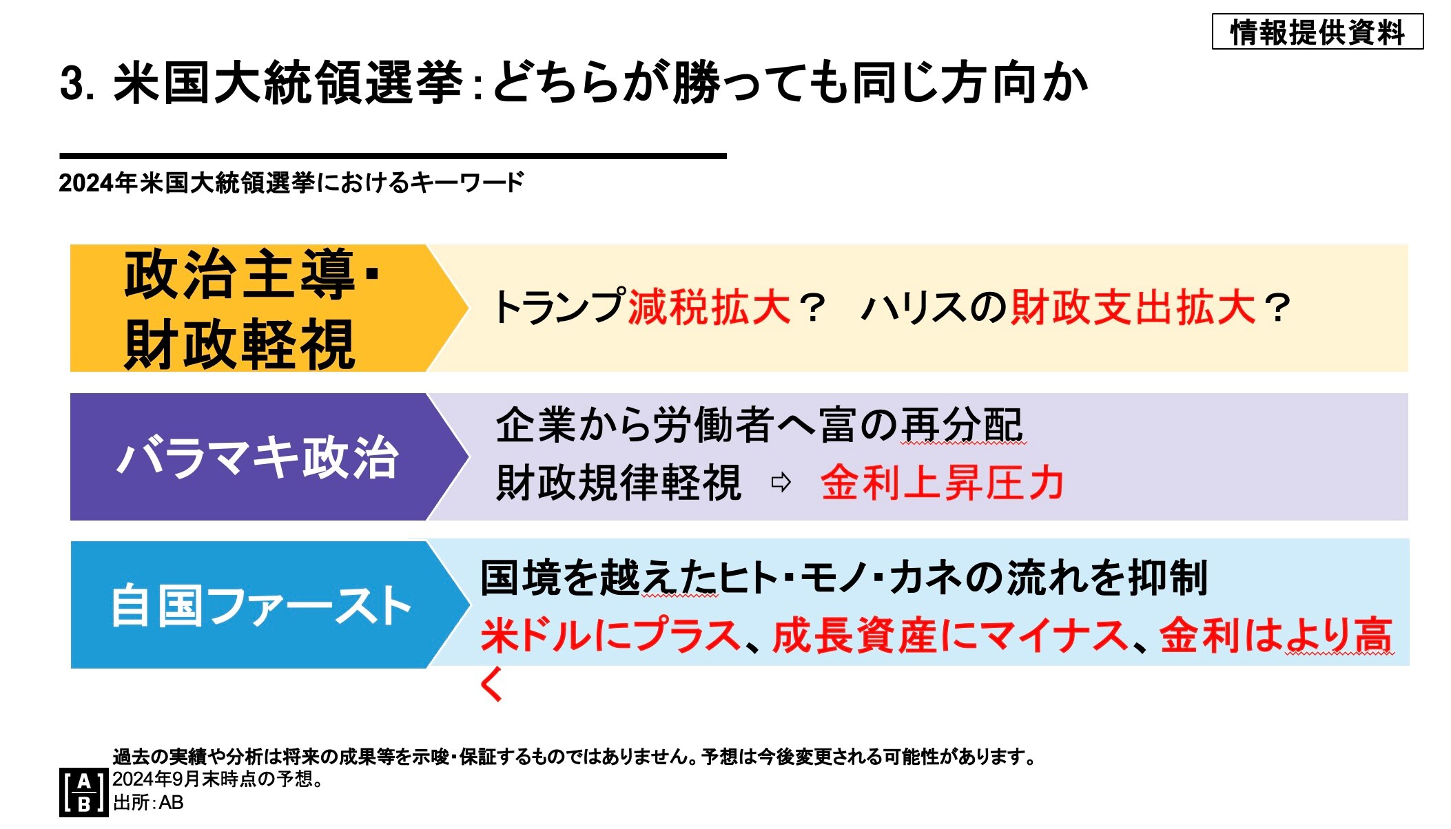 今回の大統領選の特徴の1つは、両候補の主張について“政治主導”“バラマキ政治”“自国ファースト”といった共通点があること(図表3)。財政では、トランプ氏が“減税の拡大”、ハリス氏が“財政出動の拡大”と、いずれも政府支出の増大が予想されます。