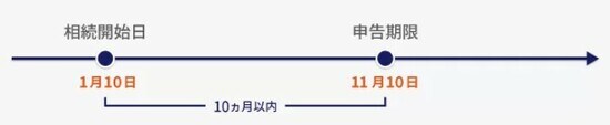 被相続人の死亡日が1月10日であった場合、相続税の申告期限を「死亡日から10ヵ月以内」と解釈していると、期限は11月9日であると判断してしまいます。しかし、正確には「被相続人の死亡日の翌日から10ヵ月以内」であり、申告期限は11月10日となります。