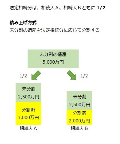 未分割の遺産だけを法定相続分で分割して分割済みの遺産に上乗せする考え方(積み上げ方式)もありますが、実務では穴埋め方式が採用されています。