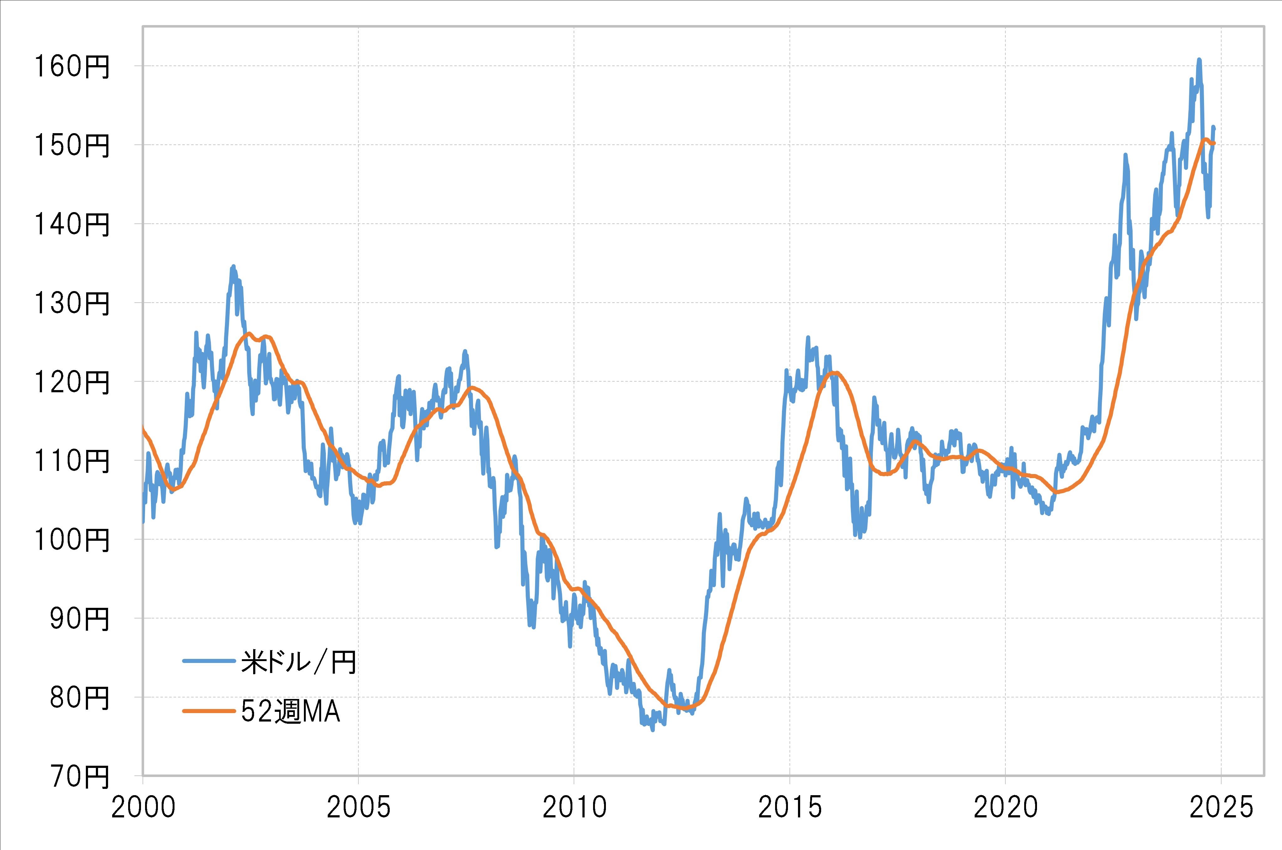 そうであれば、トレンドと逆行する一時的な上昇は52週MAを大きく上回らない程度にとどまる可能性が高いです。米ドル/円の52週MAは、足下で150.2円程度なので、経験的には一時的な上昇は、過去の実績を参考にすると155円を超えられないという見通しができるのではないでしょうか。