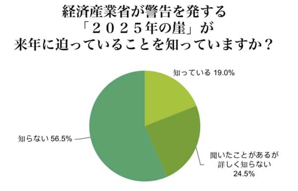 今回のアンケートで「『2025年の崖』が来年に迫っていることを知っているか」と聞いたところ、「知っている」と答えた経営者は19%にとどまった。最も多かったのは「知らない」で56.5%、次に多かったのは「聞いたことはあるが、詳しく知らない」で24.5%だった。「知らない」「詳しく知らない」を合計すると81%に達し、大半の経営者がこの分野について知識不足であることが浮き彫りになった。