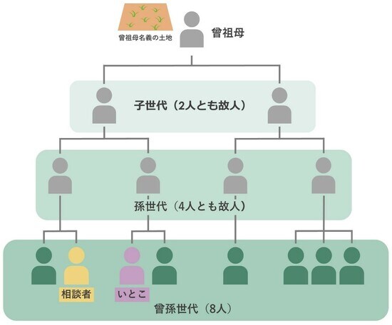書類と一緒に送られてきた家系図を確認したところ、大山さんの母親が土地の名義人である曾祖母の孫のうちの1人で、孫世代の4人は全員がすでに他界していました。そのため、曾孫世代が代襲相続人となり、大山さんとその妹、いとこ、そのほか5人の合計8人が相続人になっています。