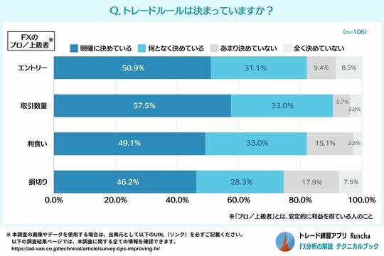 FX上級者にトレードルールが決まっているか質問したところ、エントリー/取引数量/利食い/損切りのいずれの局面でも、大半の人が「明確に決めている/何となく決めている」と回答する結果となりました。また、ほぼ半数が「明確に決めている」と回答しており、トレードルールを重要視している姿勢が見られます。