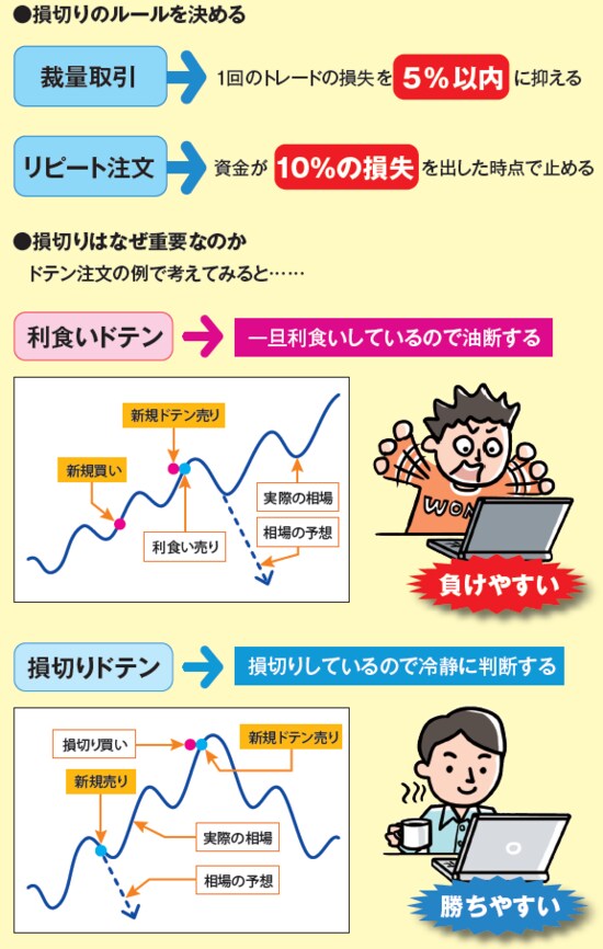 裁量取引では、1回の売買での損失を5%以内に抑えるべきだといわれます。たとえば、50万円の資金で取引をはじめたとすると、損失が2万5000円に到達した時点で損切りを行うのです。