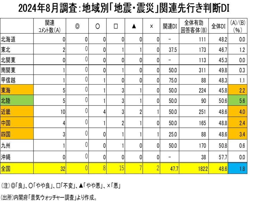 8月8日に気象庁が、「南海トラフ地震臨時情報(巨大地震注意)」を発表したことなどで、7月で6名だった先行き判断のコメント数は8月に32名に増加しましたが、その後落ち着き9月では12名に、10月では8名に減少しました。