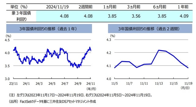 ここ2週間の豪州3年国債利回りは、横ばいとなりました。11月5日のRBAによる金融政策決定会合において事前予想通りに政策金利の据置きが決定されましたが、市場は米国の大統領選挙のトランプ候補の勝利を受けて米国国債利回りが上昇したことに反応し、連れて豪州3年国債利回りは上昇(債券価格は下落)しました。その後14日のパウエルFRB議長の今後の利下げを急がないとの発言を受けて翌15日は米国株安となりました。米国国債利回りが低下したことに連れて豪州3年国債利回りは低下したものの、期間を通じてみると、同利回りは横ばいとなりました。