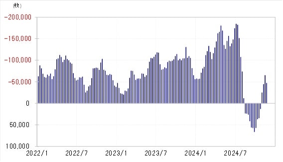 ただそんな米ドル買い・円売りポジションは、米ドル高・円安に一巡感が出てきたことを受け、先週にかけて修正の兆しが出てきました。CFTC(米商品先物取引委員会)統計の投機筋による円ポジションは、売り越し(米ドル買い越し)が19日現在で4.6万枚となり、1週間前の6.4万枚から縮小しました(図表5参照)。