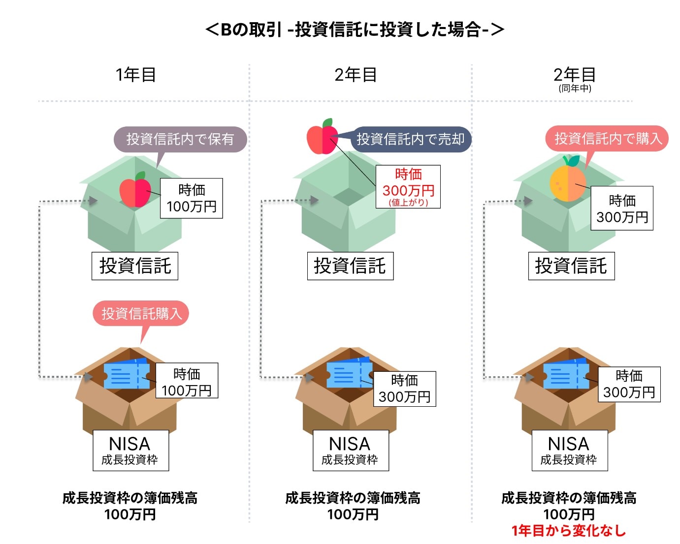 一方でBの取引では、初年度のNISA利用額は100万円とAの取引と同様ですが、2年目になっても投資している投資信託そのものの売却はないため、2年目の終了時点でもNISAの利用額は100万円のまま、生涯では残り1,700万円の追加投資ができます。
