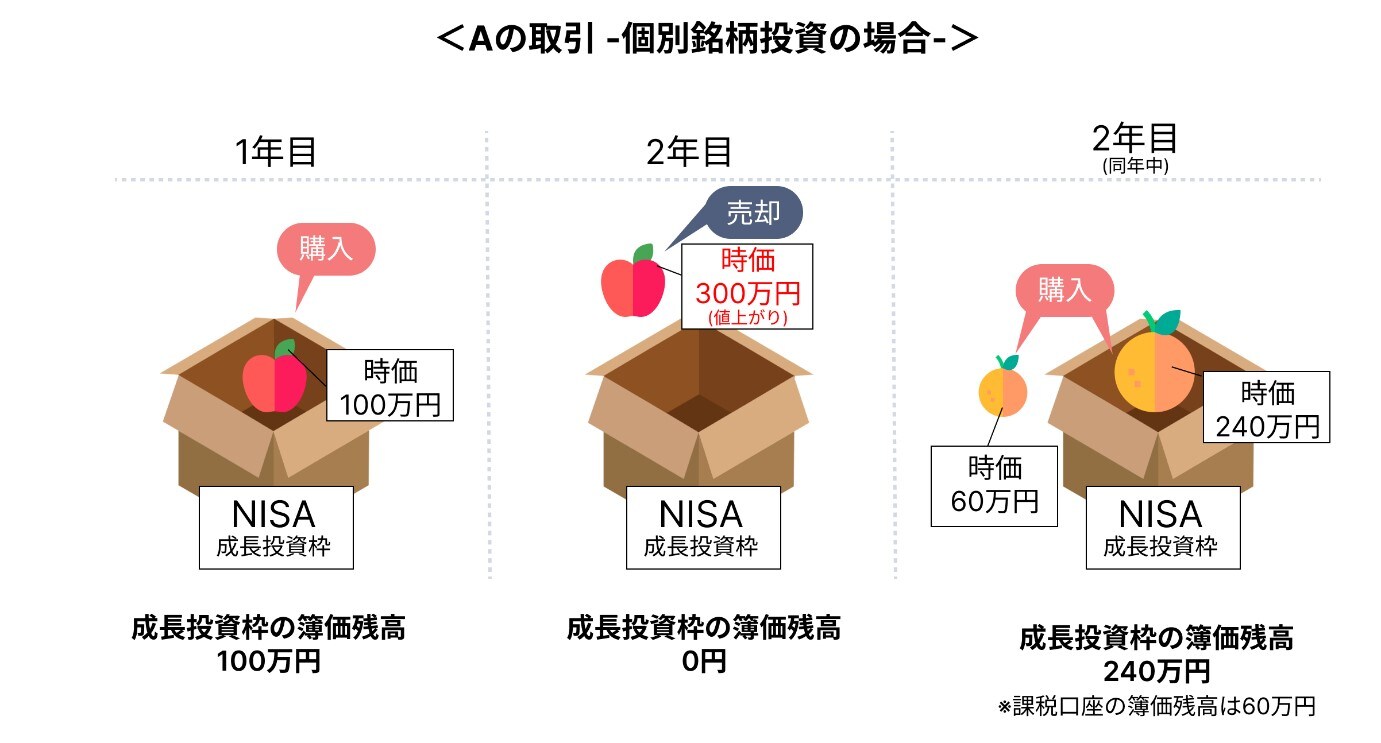 Aの取引では、初年度はNISAの利用額は100万円で終了したあと、2年目に「アップル自動車」300万円の売却を行い、同年中にその300万円をもって「オレンジ重工」を購入しようとします。