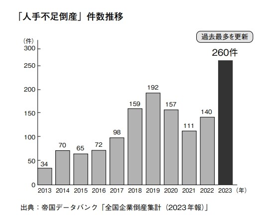 実際、帝国データバンクの「全国企業倒産集計(2023年報) 」によると「人手不足」による倒産が増加傾向にあり、2023年にはその件数が260件にのぼり、過去最多になりました。人手不足が原因で倒産した企業は業種別では建設業が91件で最も多く、続いてサービス業(IT産業、人材派遣業など)運輸・通信業となっています。