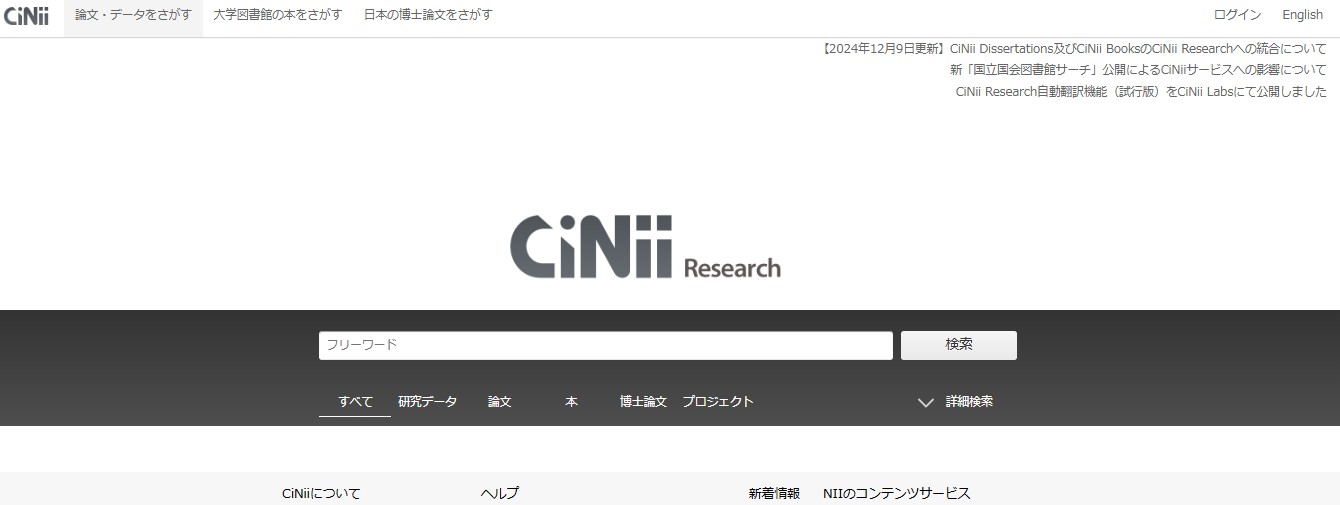 「Citation Information by NII」の略で、国立情報学研究所(NII:National institute of informatics)が運営。日本のあらゆる学術分野の論文、学会誌など各種文献、雑誌記事索引、研究データやプロジェクトを検索できる「CiNii Research」、大学図書館の総合目録データベース「CiNii Books」、博士論文データベース「CiNii Dissertations」の3種があり、ネット上で無料で公開されていて、誰もが登録などなしで利用できます。
