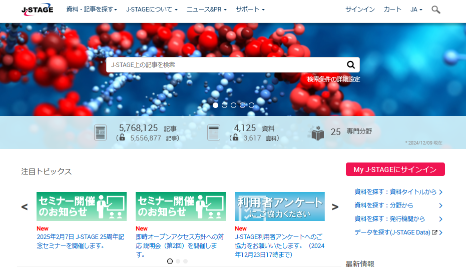 国立研究開発法人科学技術振興機構(JST)が運営。日本の医学・薬学系・工学系を中心に、自然科学、人文科学、社会科学などの科学分野の学会誌、論文を電子化し、ウエブ上で公開。誰もが無料で利用できます。IDとメールアドレスなどを登録すれば、お気に入りの記事の保存、お気に入りの資料を引用する新しい記事配信の通知、検索履歴の保存などのサービスも利用できます。