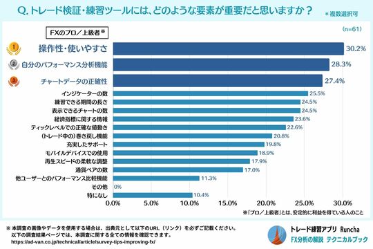 最も多かったのは「操作性・使いやすさ」で、30.2%でした。このことからは、トレード検証・練習ツールをストレスなく使いこなせることが、効果的かつ継続的な練習につながると考えるFX上級者が多いことがうかがえます。使いやすさは、スキルアップにおいて非常に重要な要素といえそうです。