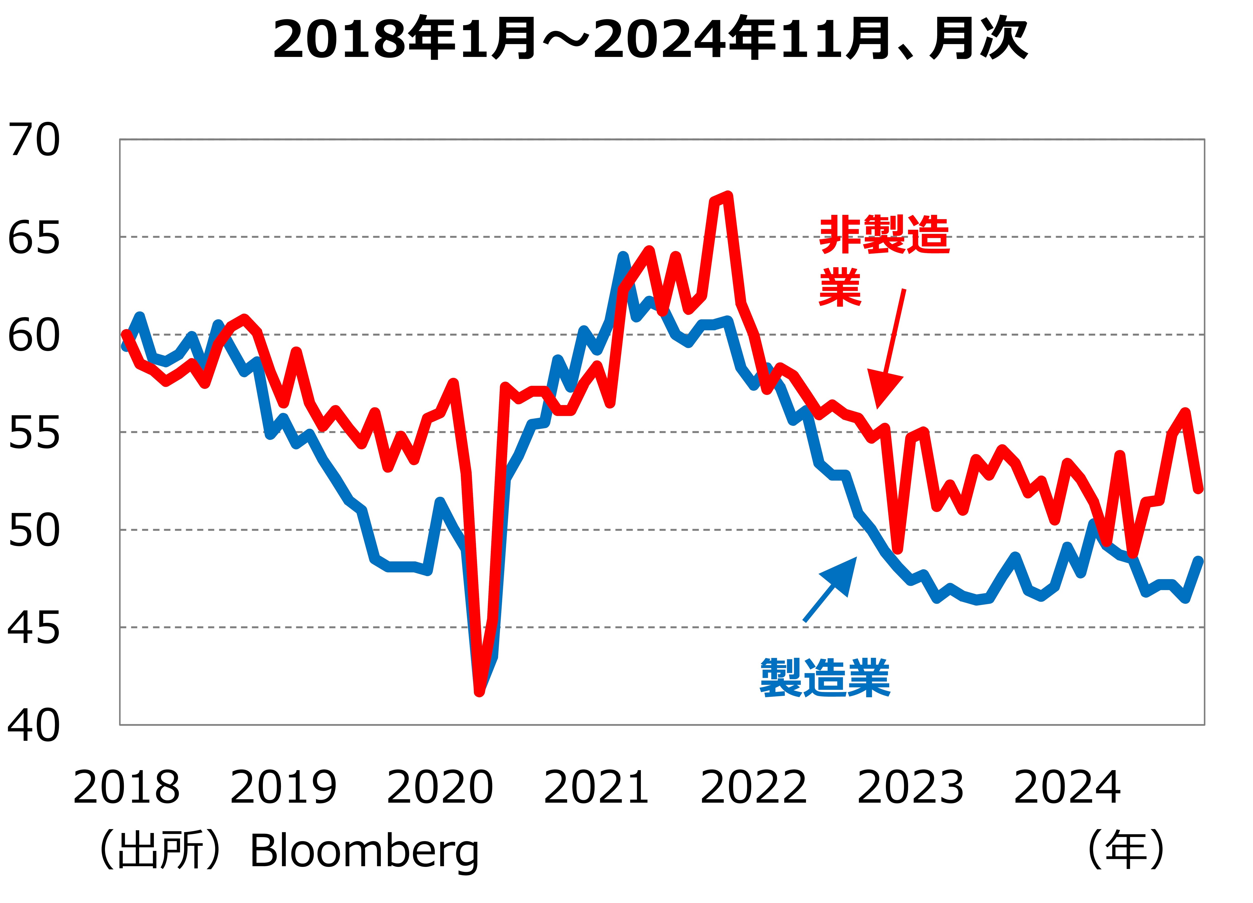 11⽉はハリケーンの影響の反動に加え、ボーイング社や港湾のストライキ終結、⼤統領選挙に対する不透明感の解消などが、製造業の景況感を押し上げたとみられます。