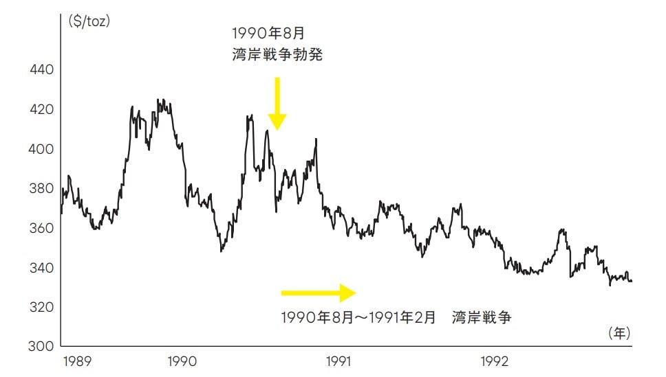 グラフから湾岸戦争勃発時には、金の価格が一時的に上昇しましたが、戦争が短期間で終結し、金の価格は逆に下落していることがわかると思います。