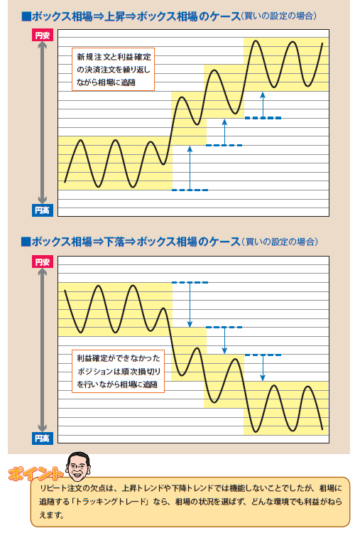 従来のリピート注文でも、ボックス相場の水準が変わったときには、手動で設定をし直せば、再び、リピート注文の機能させることはできます。