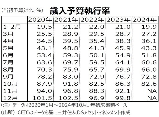年初来累積ベースで、月次歳入の年間当初予算執行率を見ると、10月時点で82.6%と、コロナ期間の2022年並みの低さにとどまっている。同じベースで前年同期比を見ると、1-2月の▲2.3%以降、マイナスが続いており、10月は▲1.3%であった。低インフレ局面では名目GDP成長率が低迷するため、租税弾性値が同じとしても歳入額は下振れしやすくなる。歳入額が下振れすると、財政規律の環境下では歳出額を抑制する必要に迫られるため、財政政策による需要創出が更に困難になるという悪循環に陥りやすい。