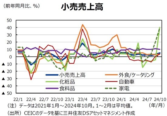10月の小売売上高は市場予想を上回った。一連の景気対策発表に伴うセンチメント改善に加えて、11月11日の独身の日セールスが10月に早期実施された影響が顕在化した可能性がある。この場合、消費需要は前倒しで顕在化しているため、11月の小売売上高は反動で下振れる可能性があり、要注意とみられる。実際、10月に上振れた品目は化粧品、家電といった独身の日セールスの目玉商品は一部。自動車の好調は補助金付き買い替え対策の影響が大きいが、この予算にも限りがある。また、食料品の伸びは長期間、外食/ケータリングを上回っており、節約するために自炊が選好されている可能性がある。