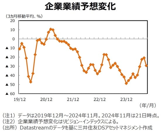中国の全人代常務委員会が発表した地方政府の債務対策などが市場の期待を下回ったことなどが嫌気された。また、10月の消費者物価指数(CPI)や生産者物価指数(PPI)が市場の事前予想を下回り、デフレ懸念が高まったほか、トランプ次期米大統領による関税引き上げなどの保護主義的政策に対する懸念が高まったようだ。株式市場では、地政学リスクの高まりが意識され変動性が高まる展開が想定される一方、中国政府が国内経済の回復に向けた景気刺激策を強化していることなどから、中長期では安定化が予想される。