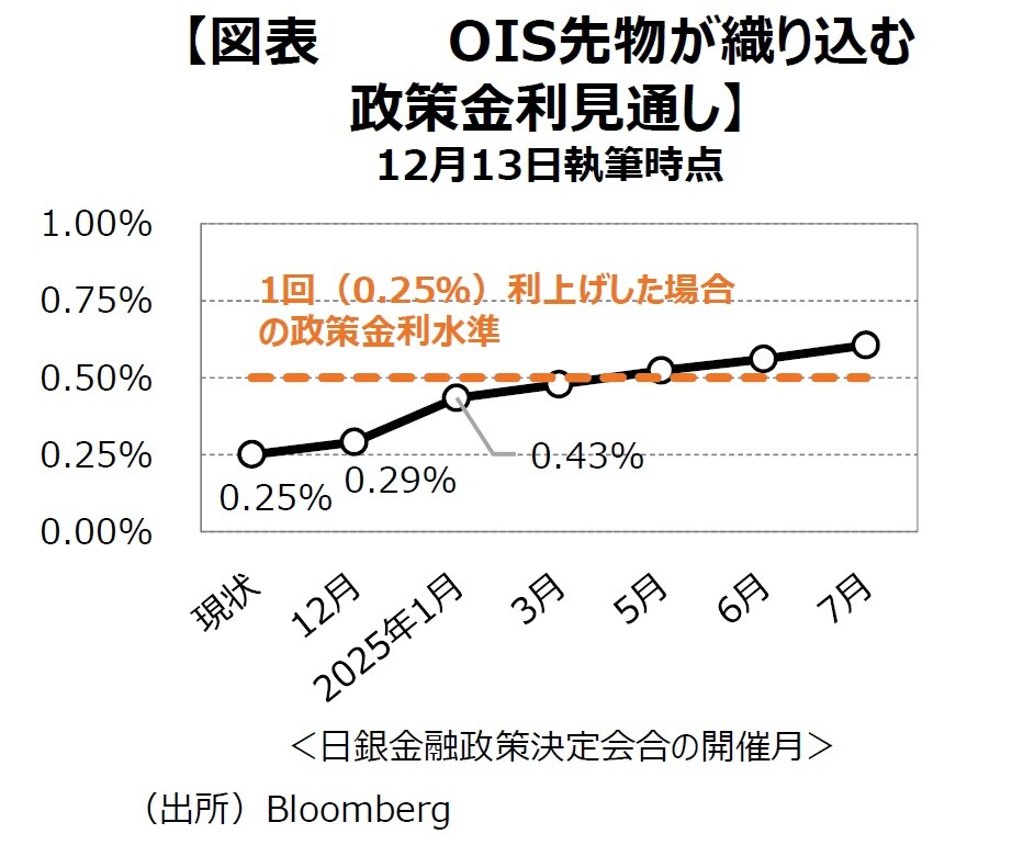 来年の春闘で中⼩企業が賃上げに前向きな姿勢を⽰すかは、2025年1⽉23⽇〜24⽇の会合前に開催される⽀店⻑会議でおおよそ判明することになるため、市場では1⽉での追加利上げを予想する向きが増えています(図表5)。