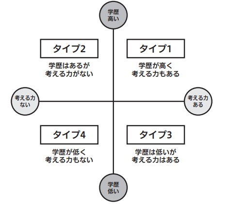 こうした二つの観点が出てきたとき、私たちはそれを掛け合わせて考えてみます。「学歴が高い/低い」と「考える力がある/ない」といった2つを掛け合わせると下の図表のような形に整理することができます。