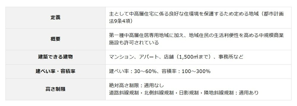 第一種中高層住居専用地域では、第一種・第二種低層住居専用地域とは異なり、絶対高さ制限がなくなり、中高層の共同住宅やマンションの建設が可能な地域です。ただし、道路斜線規制・北側斜線規制・日影規制に加えて、隣地斜線規制が適用されます。建設可能な店舗としては、床面積が500㎡以下のものまで制限が緩和されるため、物品販売店舗・飲食店・損保代理店・銀行の支店・教育施設や医療施設なども建設できることから、利便性の高い居住環境を形成します。