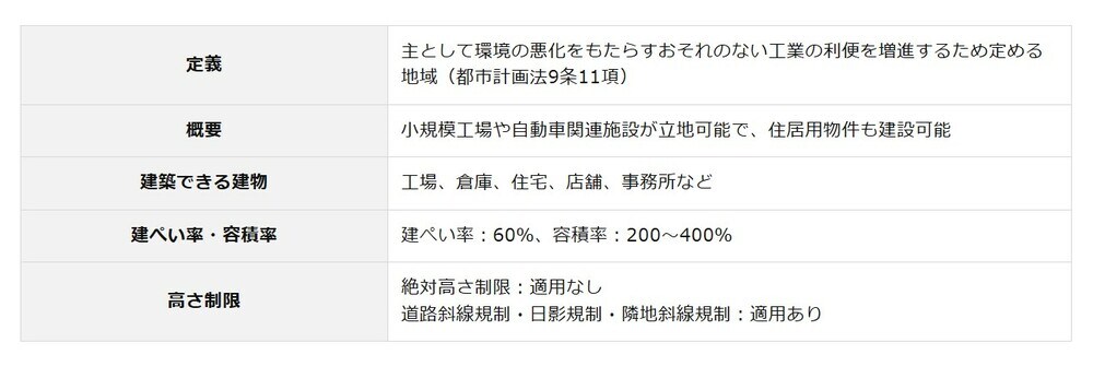 工業専用地域は、最も純化された工業地域であり、住宅や商業施設などの建設が厳しく制限されています。大規模工場や危険性の高い施設の立地が可能で、工業に特化した土地利用を図る地域です。