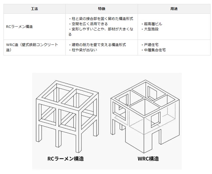 このように、両工法ともRC造の基本的な特徴である高い強度、耐久性、耐火性を備えていますが、それぞれの構造特性に応じて適した用途が異なります。