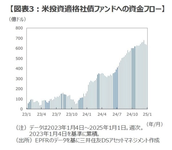 ■2024年は米投資適格社債市場への資金流入が加速しました。米調査会社EPFRによる投資信託を通した資金フローをみると、米投資適格社債ファンドには、2024年に474億ドル(約7.4兆円)の資金が流入し、2023年の153億ドル(約2.4兆円)を大きく上回りました。